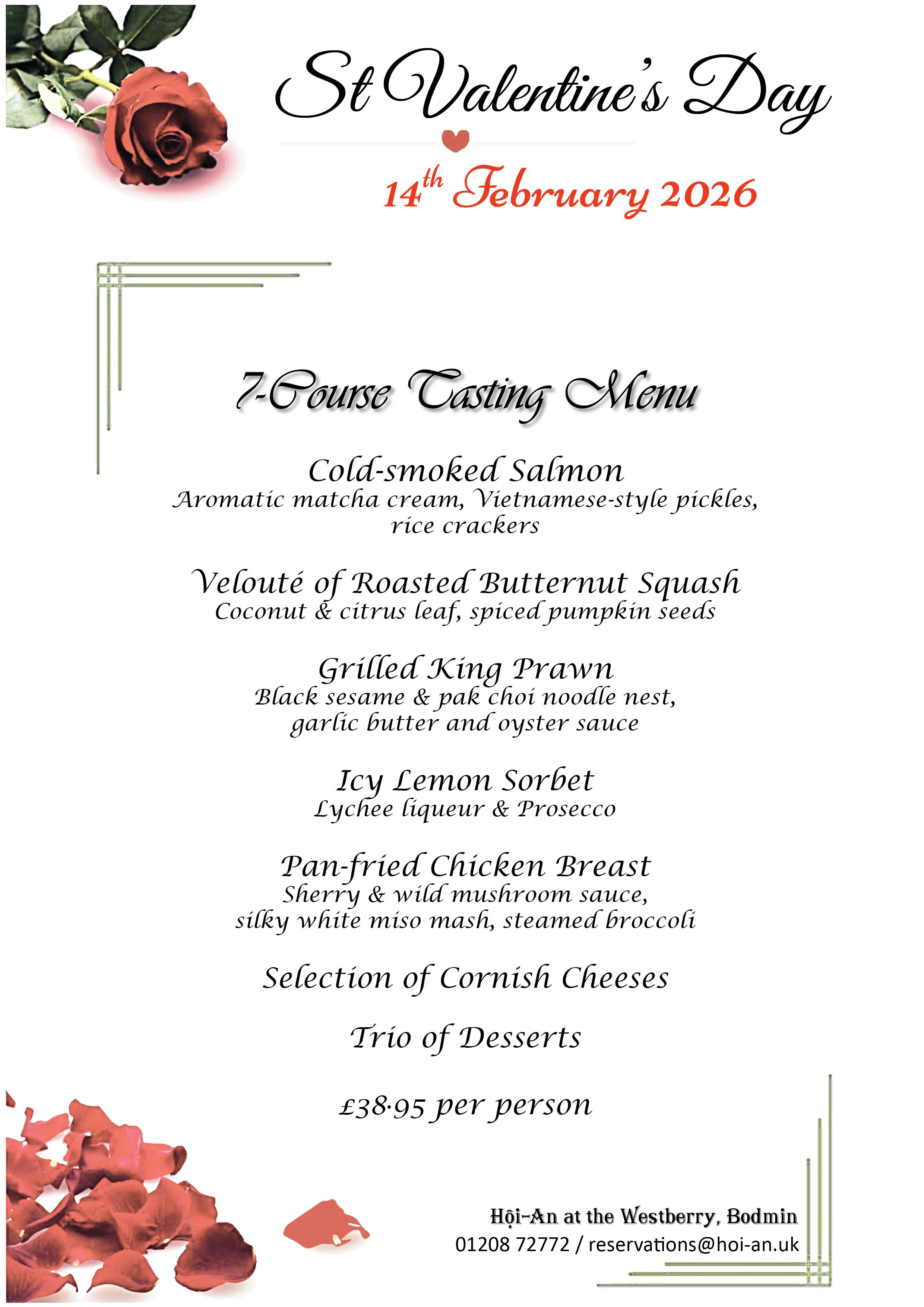 St Valentine's Day is one of the most popular events in the Westberry Hotel / Hội-An calendar, and we were taking bookings even before the menus were announced, So, to ensure that those of you waiting for our menus to be published are not disadvantaged, we include graphical versions of these opposite (click an image to freeze it if you need more time to assimilate the contents). Accessible versions (both omnivore and vegan) in Adobe PDF are also available online. Early booking for this very popular event is strongly advised.